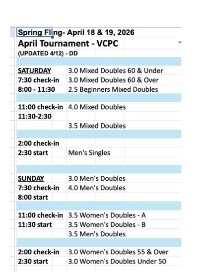 Tournament has been postponed to Saturday, April 18 & Sunday, April 19. We have open spots in 3.5 Mixed Doubles & 3.0 Women's Doubles. Contact us at tournaments@venturacountypickleballclub.com if you can play